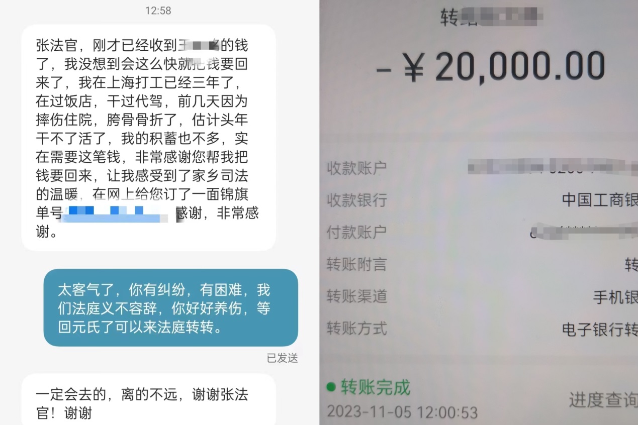 ![]() 昨日,元氏法院“能动司法+诉源治理”集中宣传活动现场气氛高涨,群众反响热烈,当天下午就有群众来到南佐法庭…… 事情是这样的: 赵先生是元氏前仙乡人(前仙乡属南佐法庭辖区),现在上海打工,2021年年底跟他同在上海打工的元氏老乡王某,因急需用钱,从赵先生处借了2万元,后王某从上海离职,赵先生多次联系未果。 近日赵先生因摔伤住院急需用钱。其亲戚通过我院在南佐大集的宣传,了解了法院的诉前调解,于是将有关情况告诉了人在上海的赵先生。当天下午赵先生便通过亲戚联系到南佐法庭的张文静法官寻求帮助,张文静了解到赵先生的情况后,当即拨打了王某的电话,但连续拨打几次,均无人接听,后张文静联系了王某所在村的特邀调解员,特邀调解员通过走访、打听,了解到王某目前在石家庄某商场工作,恰好该商场距离张文静法官家不远,张文静便同其家属来到该商场,找到了王某,向王某讲述了赵先生目前的情况,从法理、情理不同角度释法明理、耐心劝解,最终王某当场联系亲戚朋友筹钱,将拖欠赵先生的2万元如数归还,电话里还对赵先生的伤情进行了关心和问候。 ![]() “看着昔日好友冰释前嫌,我在心里由衷地替他们高兴”,张文静说。 通过“能动司法+诉源治理”工作机制的诉前调解方式,该案从收到结仅用时一天,并得以当场履行。解纷成本小、耗费时间短,真正做到解决纠纷方便、快捷、高效,实现案结、事了、人和。 稿件来源:元氏县法院 |